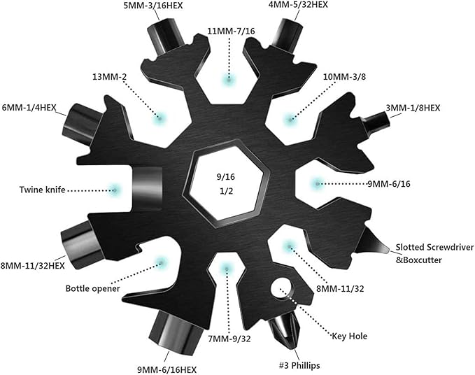 - 18-in-1 Snowflake Multi-tool: Slotted Screwdriver and Box Cutter, Rope Cutter, Bottle Opener, Key Hole, Phillips Screwdriver: Metric (millimeter) - 3; SAE (inch) - 1/8, Allen Wrench: Metric (millimeter) - 3-4-5-6-8-9; SAE (inch) - 1/8-5/32-3/16-1/4-11/32-6/16, Outer Hex Wrench: Metric (millimeter) - 7-8-9-10-11-13; SAE (inch) - 9/32-11/32-6/16-3/8-7/16-1/2 .
