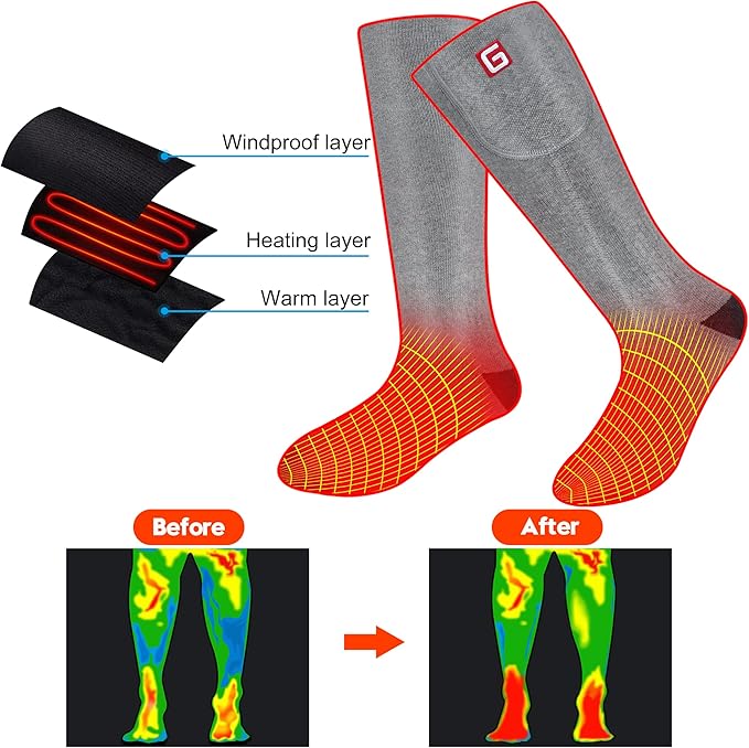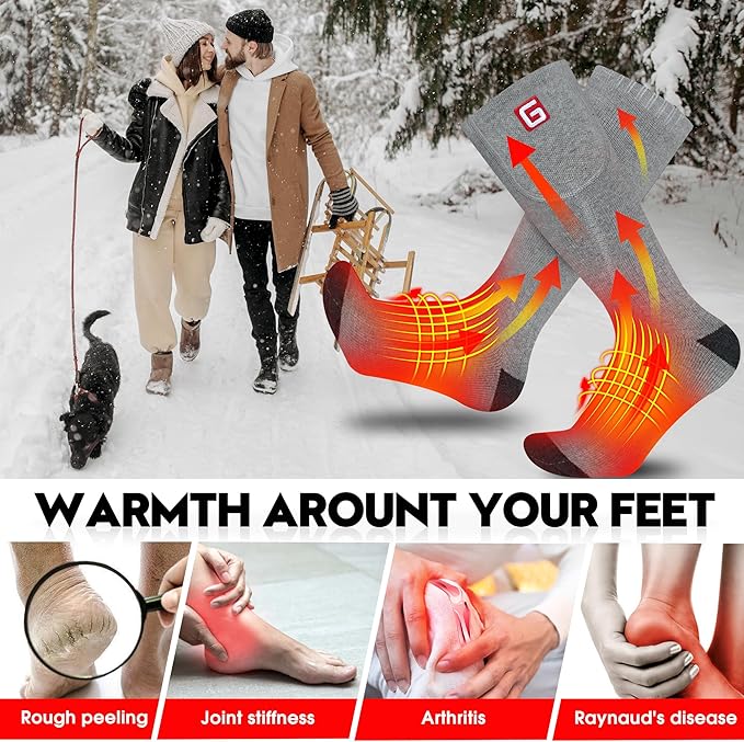 - ⛷Improve Blood Circulation: Rechargeable battery operated electric heated socks with far infrared fiber heating elements, help those who have rthritis, Raynaud’s, Stiff Joints or chronic circulation issues, improve blood circulation and reduce soreness. Electric insulated material offers you safe thick socks, keeps your feet warm and comfortable in cold winter.
