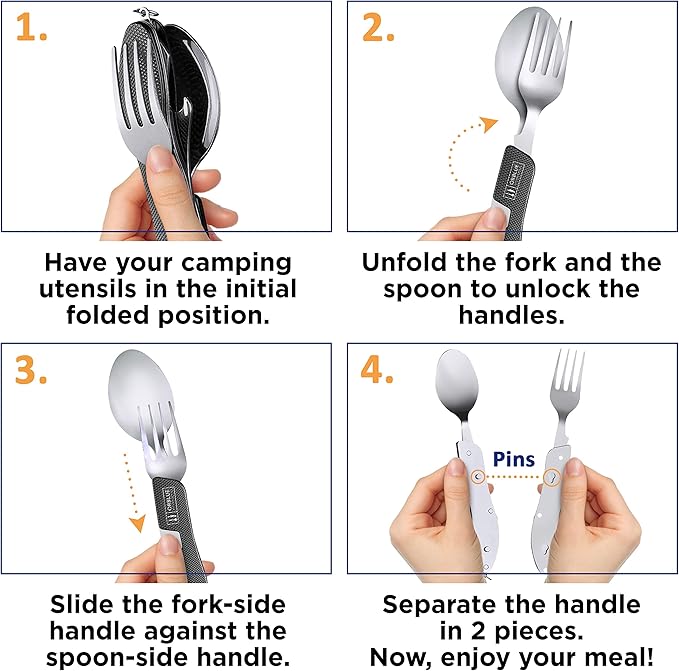 - 🍴 NO MORE BULKY OR BROKEN CUTLERY - Take the hassle out of eating when backpacking, hiking, or fishing. Ditch flimsy disposables or bulky silverware with our 4-in-1 tactical backpacking utensils.