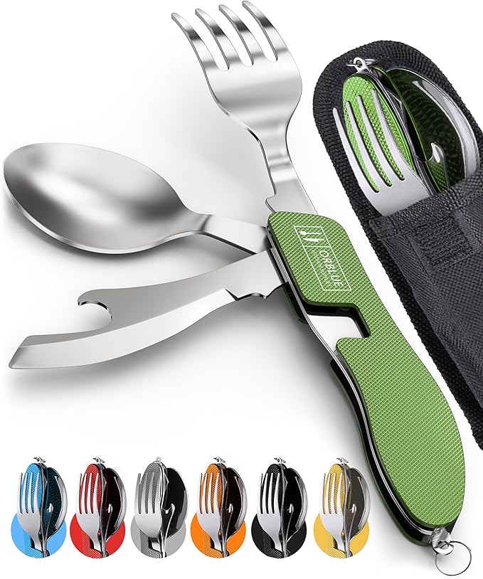 - 🍴 DINNER ESSENTIALS IN YOUR POCKET - Make eating out in the wild simple. This camping flatware tool lets you easily scoop, cut, and spear your meals. Plus, it fits perfectly in your pack or pocket.