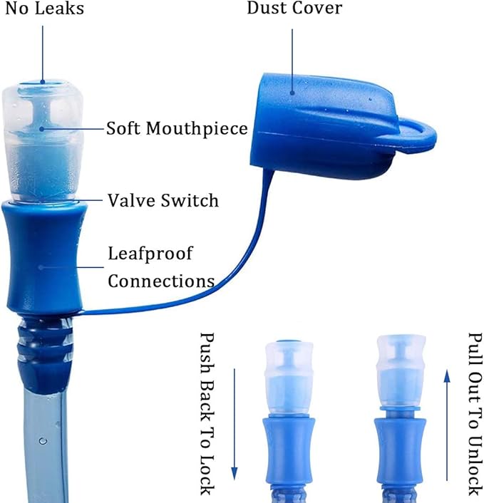 - UPGARDE LEAK PROOF:Soft yet durable mouthpiece with easily accessible ON/OFF valve non-leaking. You can control the water flow by biting, First pull up on the drinking cap, gently bite the mouthpiece with your front teeth to have a sip and start drinking, push back to stop water flow. Quick-release tube is detachable. Auto shut off while the tube is removed, the hydration bladder will stay filled non-leaking. The water storage reservoir also has a dust cover to keep dirt out.