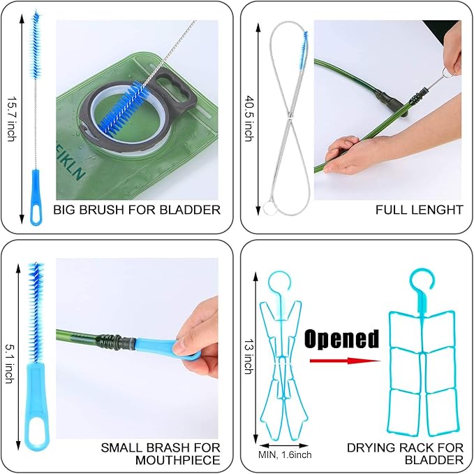 - LARGE-DIAMETER OPENING DESIGN & 4 in 1 CLEANING KITS : HEIKLN 2l hydration bladder has one of large opening, and the big opening makes for easy pouring of water. It is also fairly wide for a hand or bottle brush easily access to the interior water bladder. The screw on cap goes on and off easily. For cold water, simply add ice cubes directly from a scoop or refrigerator ice dispenser. The smooth inner of water reservoir promotes health and is easy to clean.