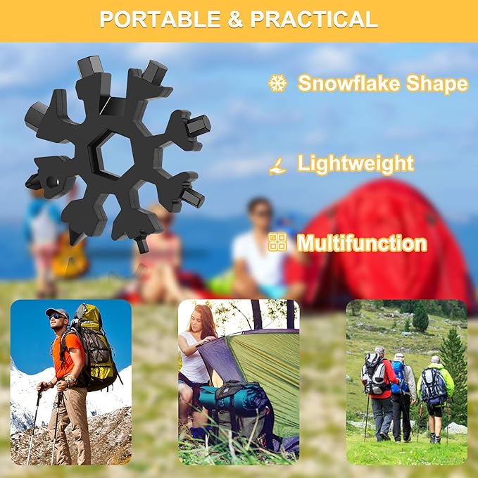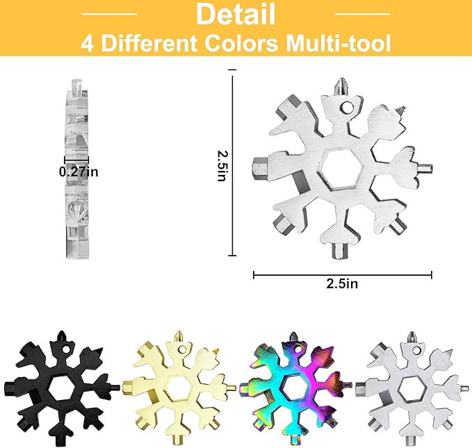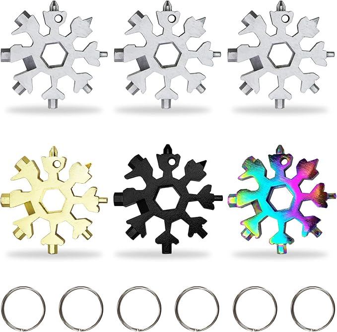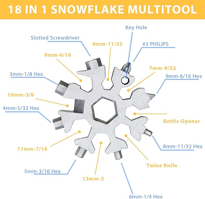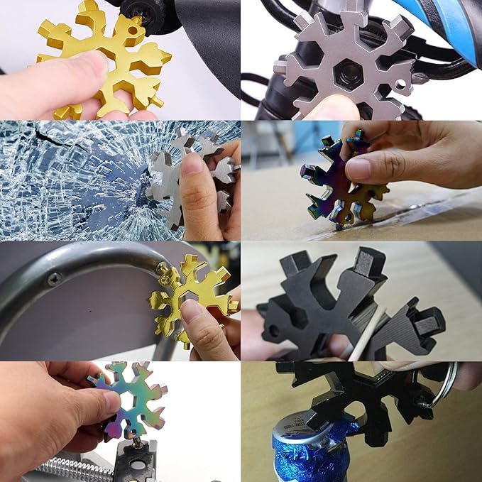 - 18 in 1 SNOWFLAKE MULTITOOL:Each snowflake tool has more than 18 uses,such as hexagon screwdrivers,wrenches,slotted screwdrivers ,phillips screwdrivers of different sizes.It can be also used ,Bottle Opener, Box Cutter,Rope Cutter,Gift Hanging Drop,etc.