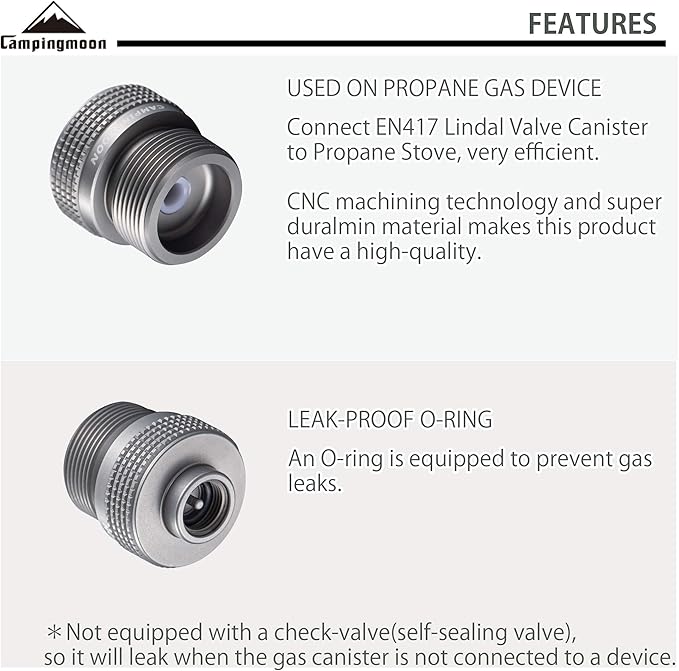 - USES: Convert EN417 Lindal Valve Canister to be able to be used on Propane Stove, very efficient. It is a useful tool for your camping, backpacking, hunting, BBQ, barbecue and other outdoor occasions.*Not equipped with a check-valve(self-sealing valve), so it will leak when the gas canister is not connected to a device. Connect the adapter to the gas device first, otherwise the gas will leak from gas canister.