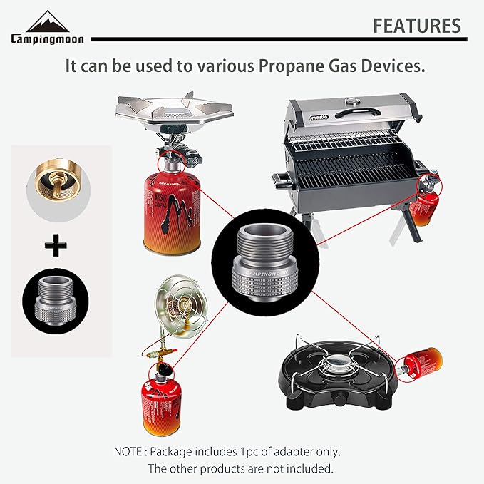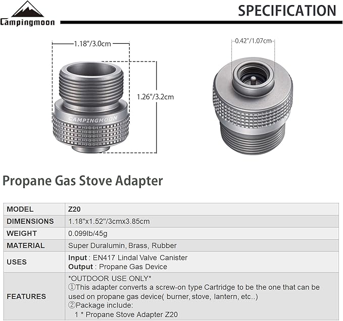 - FEATURES: *OUTDOOR USE ONLY* ①Small size. This adapter converts a screw-on type Cartridge to be the one that can be used on propane gas device(burner, stove, lantern, etc..) ②Package include: 1 * Propane Stove Adapter Z20
