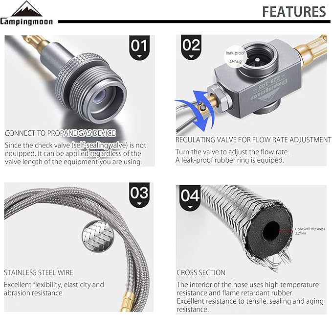 - FEATURES: *OUTDOOR USE ONLY* ①The adapter can connect EN417 Lindal Valve Canister (screw-on type) to propane gas device(burner,stove,lantern,etc..), and it is equiped with regulating valve for gas flow rate adjustment. ②Extend hose can keep your propane tank farther away from gas device, which is more convenient to use.