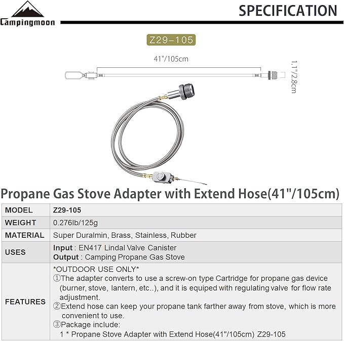 - Package include: 1 * Propane Stove Adapter with Extend Hose(41"/105cm) Z29-105