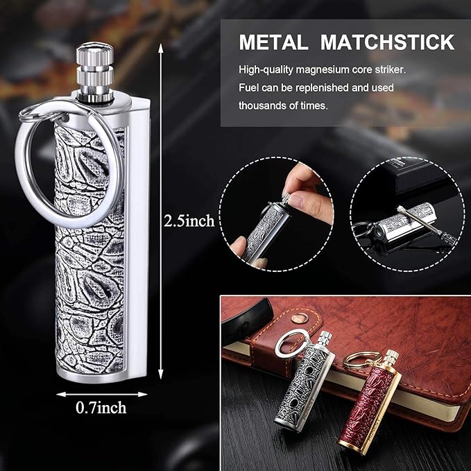 - 【UNIQUE DESIGN】 Each refillable matchstick keychain lighter is the combination of matchstick and keychain. It is not only a practical survival tool that you can carry around during the trip, but also a keychain that you can use it to hold a key, backpack and more. Portable and chic in appearance.