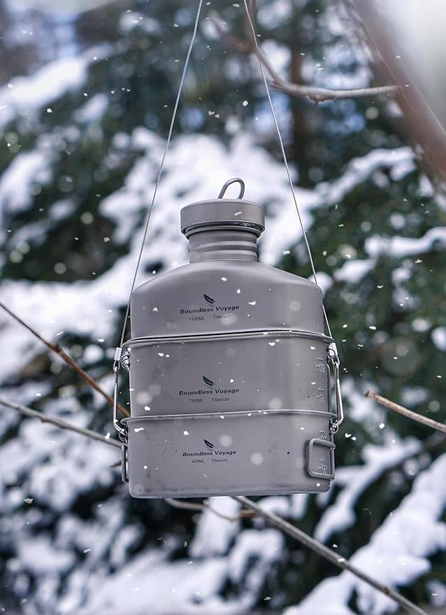 Boundless Voyage Titanium Canteen Mess Kit with Camouflage Bag Large Capacity Kidney-Shaped Camping Pot Pan Set with Lid & Hanging Chain