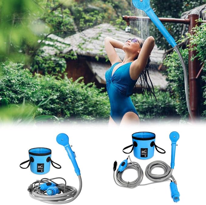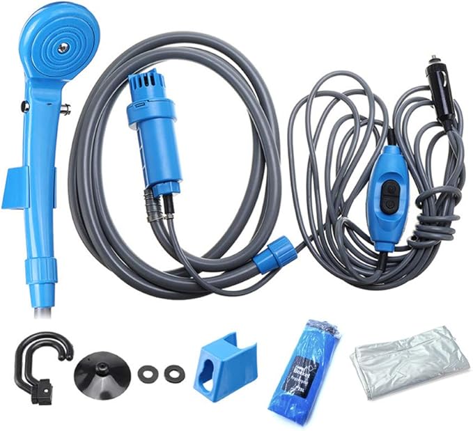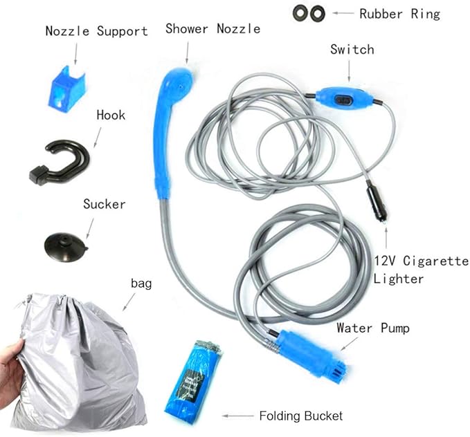 - Portable And Durable Design--It fits for any 12V car cigarette socket.The upgraded part is that you can control water volume by this shower head's metal adjuster.And new version powerful shower pump will give you more plentiful and stable water which can be kept at 3.5L/min.This shower set is lightweight and handy, easy to carry and store in luggage,backpack or car trunk.Each part is made of high quality polymer materials to prevent leakage,and provide you a long service life.