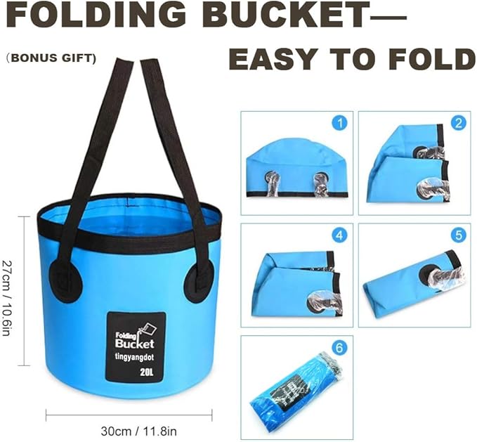 - Compact and Practical Shower--This set includes an lightweight shower head, new version powerful camping shower pump(contains some filter sponges),2 leak proof rubber rings,A storage bag,a 5M power cord and a 2M flexible hose,a nozzle support,a S-hook and a suction cup ,especially this S-hook and suction cup will free your hands.The most noteworthy is that we have also provided you with a collapsible large capacity 5 Gallon bucket(20L) with Handle which can meet your outdoor daily use.