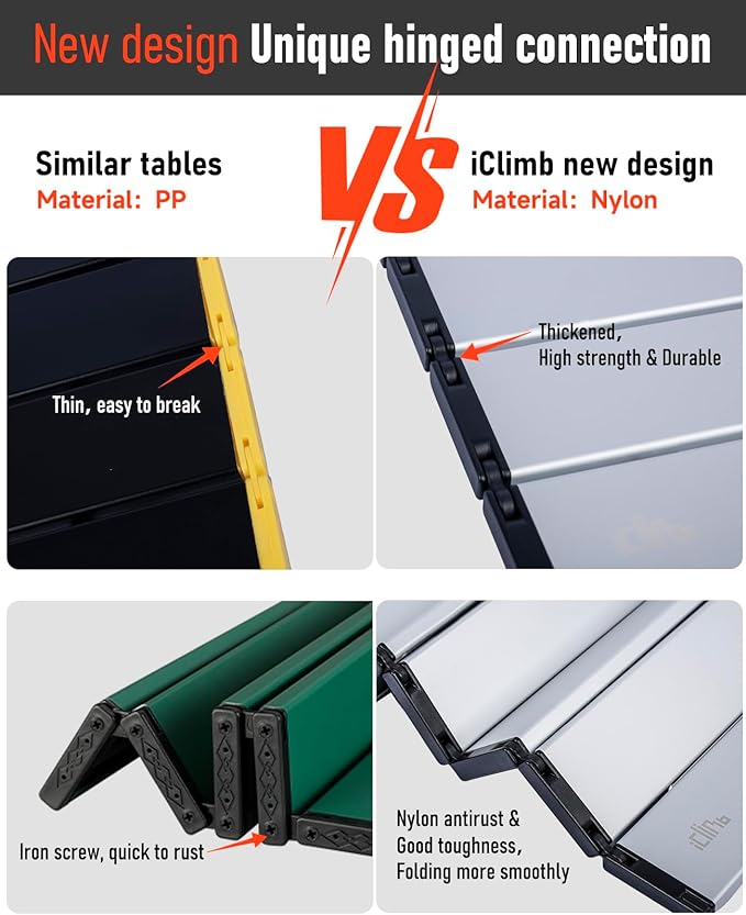 - Ultralight, made of aerospace-grade aluminum alloy, only 3 lbs; Max Load 66 lbs; Unlike wooden or nylon-top tables, this table is durable, waterproof, corrosion-resistant, easy to clean; Sturdy joints and connectors, plus anti-slip rubber feet make this table more stable, and the legs won't fold, bend, or disengage on different terrain; Very easy to set up, just open the base frame and attach the table top, enjoy your leisure time in seconds, you can also check the video in this page to see more details