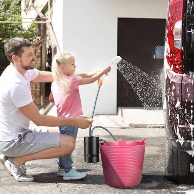 Portable Camping Shower, Built-in 4400mAh, USB Rechargeable IPX7 Waterproof Battery Shower Pump+Collapsible Bucket for Family Camp Hiking Backpacking Travel Beach Pet Flowering, Outdoor