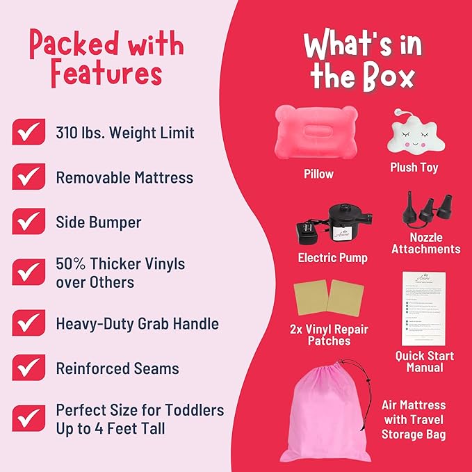 - SERENE SLEEP WITH MAXIMUM COMFORT: Make your kids smile with our toddler inflatable bed, designed to provide the most comfortable sleeping experience. Unlike other competitors’ products our kids travel bed is 50% thicker ensuring it stays inflated, and a superior choice for sleeping on the go.