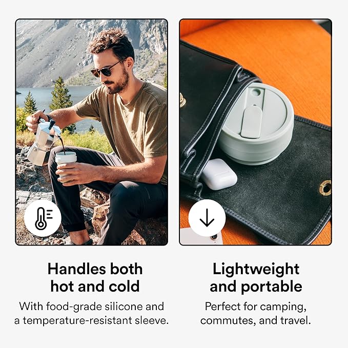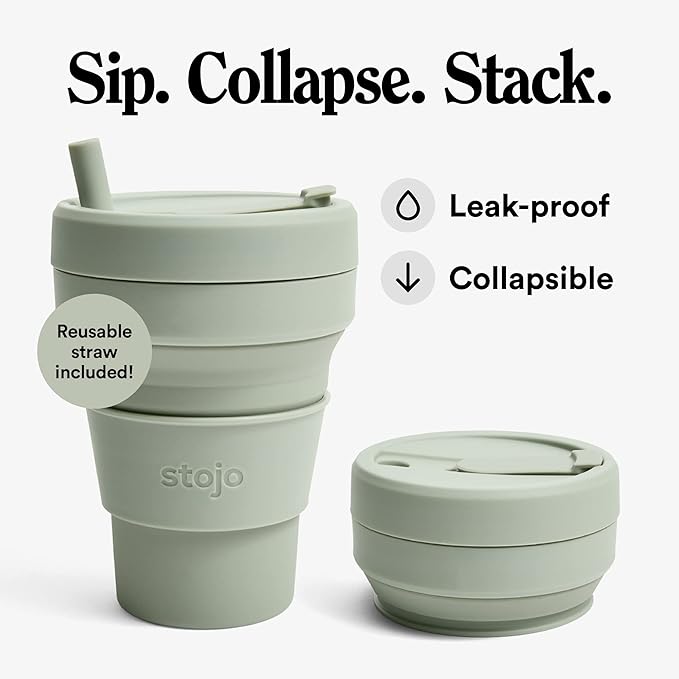 - Collapsible cup: It’s literally never been easier (or more fun) to bring your own reusable cup! The 24 oz Cup is our largest size and collapses down to just 2.5 inches. Whether you’re sipping coffee or a smoothie, this cup is perfectly portable for your commute, camping trips, power smoothies, and travels. When you’re done, simply remove the heat sleeve, open the tab, and collapse it down. Leak-proof, includes a straw, fits standard cupholders, and get a load of that Sage Green color!