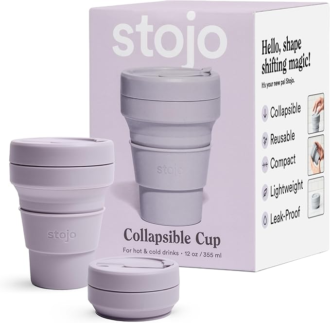 - Collapsible cup: It’s literally never been easier (or more fun) to bring your own reusable cup! This compact cup collapses down to just 2 inches. Whether you’re enjoying coffee or smoothies, the 12 oz Stojo is perfectly portable for your commute, camping trips, and travels. When you’re done, simply remove the heat sleeve, open the tab, and collapse it down. Leak-proof, fits standard cupholders, and get a load of that Lilac Purple color!