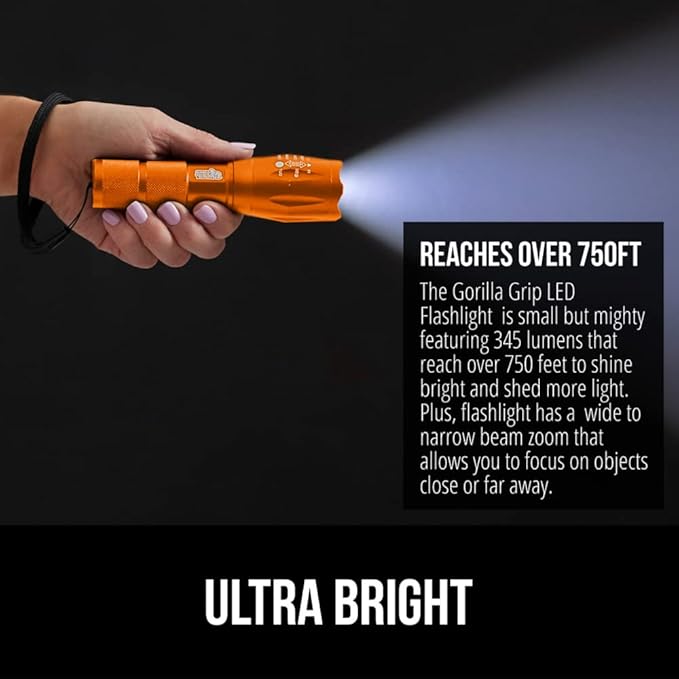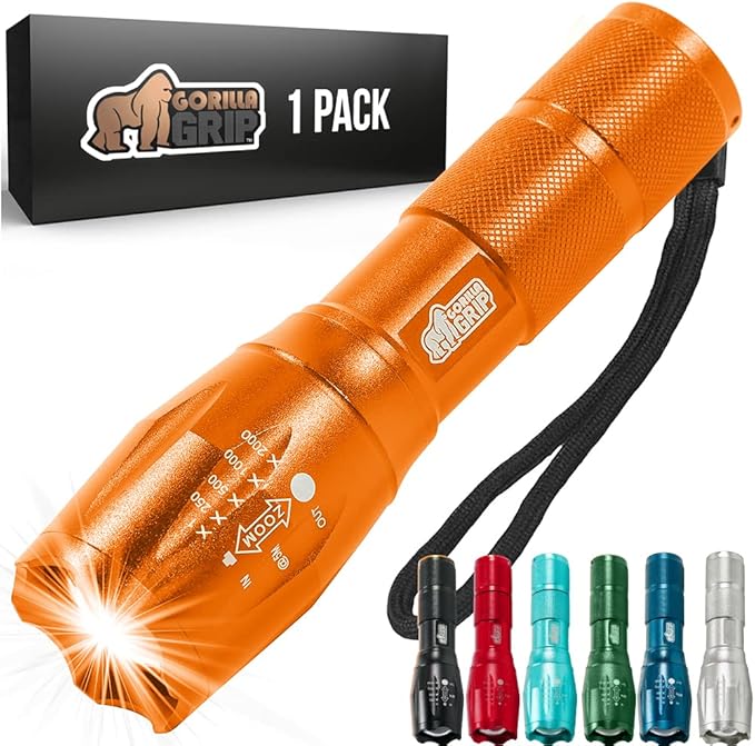 Gorilla Grip Powerful LED 750 FT Water Resistant 5 Adjustable Mode Tactical Flashlight, High Lumens Ultra Bright Battery Life Zoom Flashlights, Small Camping Car Mini Flash Light Accessories, Orange