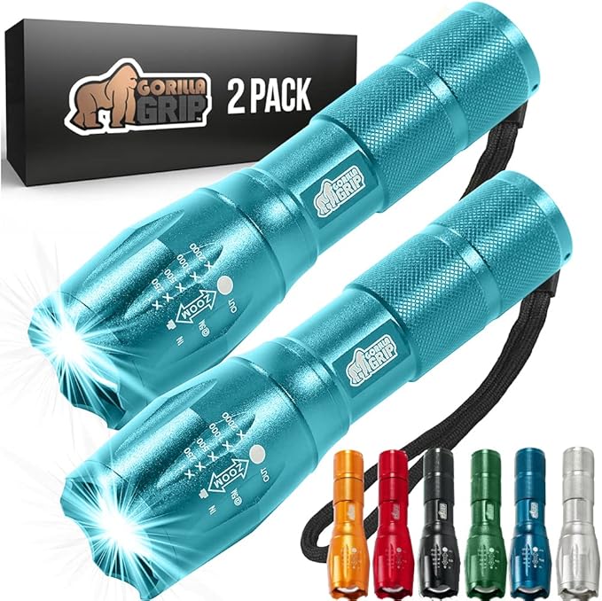 Gorilla Grip Powerful LED 750 FT Water Resistant 5 Adjustable Mode Tactical Flashlight, High Lumens Ultra Bright Battery Zoom Flashlights, Small Camping Car Mini Flash Light Accessory 2 Pack Turquoise