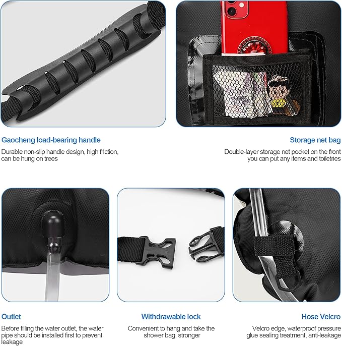 • RICH AND PRACTICAL ACCESSORIES - Our camping shower bag contains a hose, a shower head which we have upgraded and installed a convenient and practical ON/OFF knob, allowing you to easily control the water flowing; In addition, a practical mesh bag is sewn to hold some mini-travel essentials, such as small bottles of shower gel, shampoo, facial cleanser, razor, nail clippers, etc.
