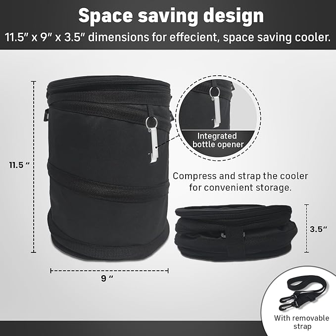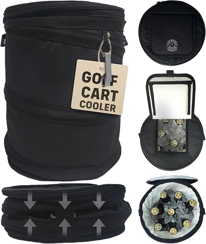- IDEAL FOR GOLF CARTS: Perfectly sized for most golf cart baskets, this golf cart beer cooler can also be strapped to the back fender using the included shoulder strap. Its versatility as a collapsible travel cooler makes it easy to pack in cars, ensuring cold drinks are always close, whether you’re on the course or on the road.