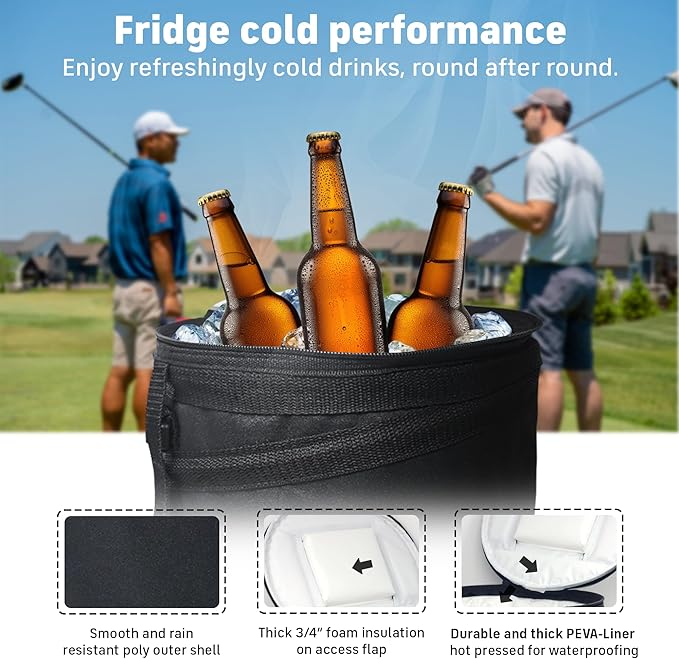 - COLLAPSIBLE AND PORTABLE: Designed with a spring-loaded frame, this collapsible golf bag cooler maintains its shape during use and folds down to just 3.5 inches high for easy storage. It fits perfectly in golf bags, suitcases, or cars, making it a must-have golf cart accessory for golfers and travelers alike.