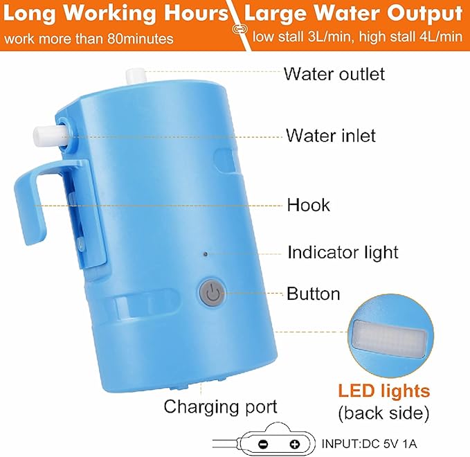 - ▶Easy Assembly And Operation - 1.8m long hose & 3 Led lights make it easier and safer for you to take a shower at a wonderful camping night. The portable camp shower with a pump lift up to 2.4 meters, it can handle heights from 0.5m to 2.2m.