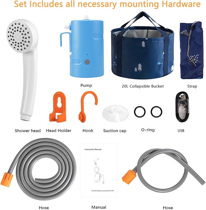 - ▶Collapsible Bucket & Suction Cup Support - The 20L capacity collapsible bucket is easy to carry and suitable for outdoor use. hower-Head Securely Sticks to Any Flat Surface with Provided Suction Cup; Bonus S-Style Hook Lets You Hang it Safely Overhead