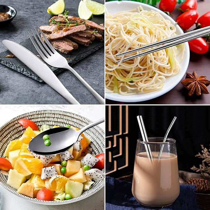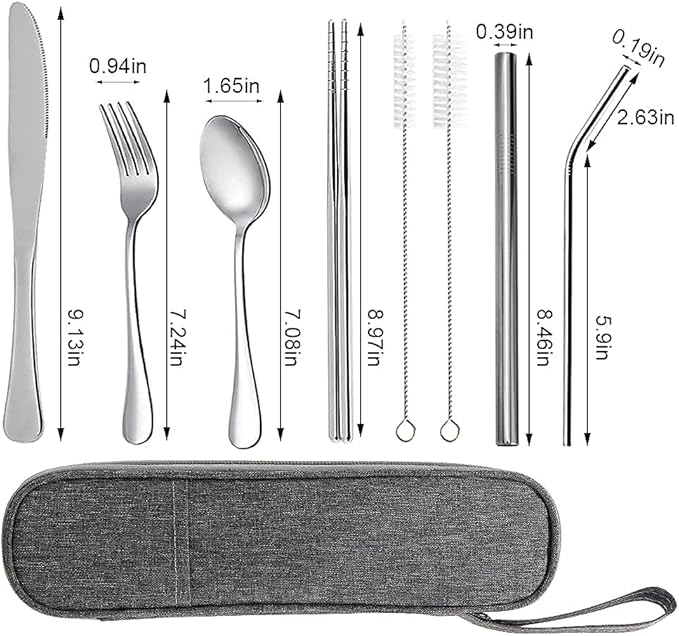- The travel utensils incluede dinner knife, fork, spoon, chopsticks, Curved straw,Boba straw,cleaning brush ,carrying bag.