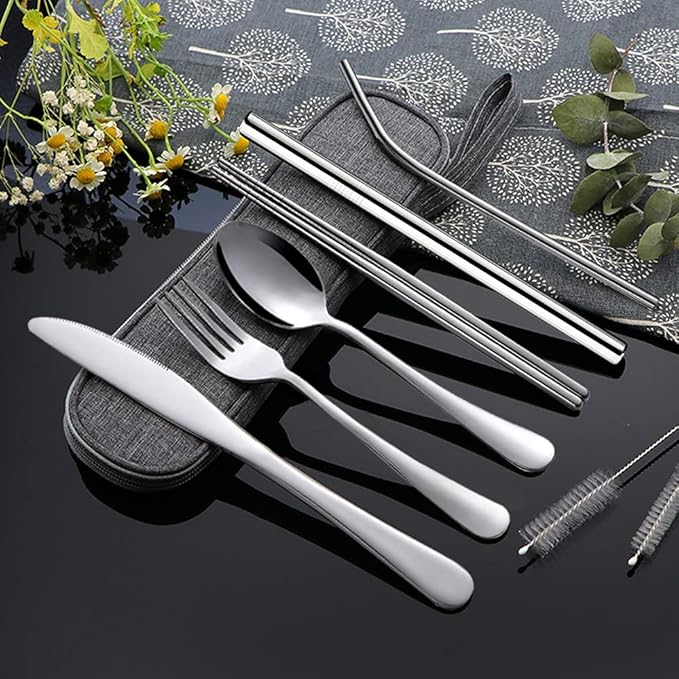 Travel Utensils with Case, Portable Travel Utensils Cutlery Set Stainless Steel Flatware Set for Camping 8pcs Including Dinner Knife Fork Spoon Chopsticks Boba Straw (Silver)