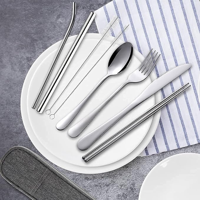 - Easy to carry: this carrying case can stabilize the travel utensil so that it'll make NO noise during the travel. This flatware set for travel is small in size and light in weight ,The cutlery set with case is a must-have for daily use. Suitable for taveling ,working ,school, flight, workplace, eating on the go ,picnic ,camping,etc.