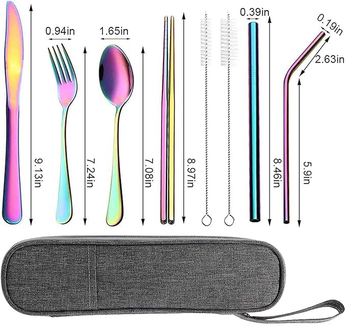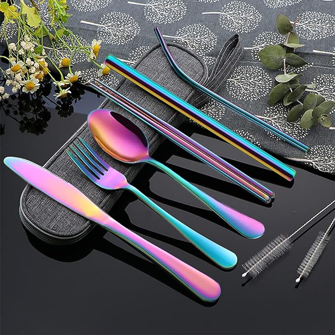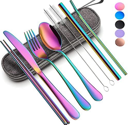 Travel Utensils with Case, Portable Travel Utensils Cutlery Set Stainless Steel Flatware Set for Camping 8pcs Including Dinner Knife Fork Spoon Chopsticks Boba Straw (Rainbow)
