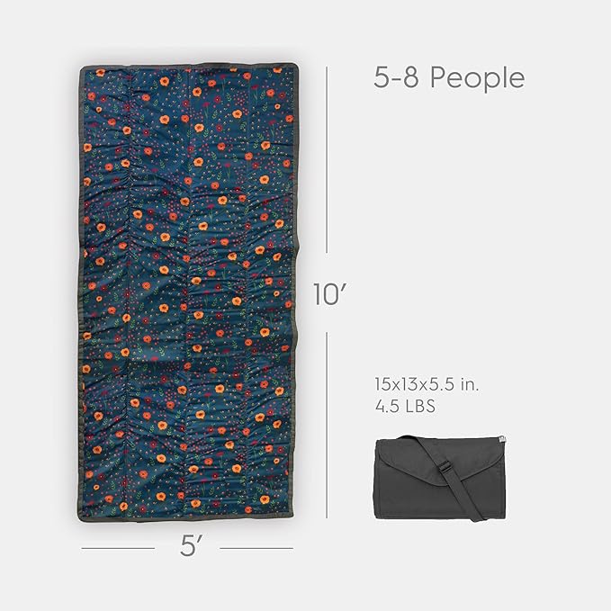 Little Unicorn Outdoor Family Picnic & Beach Blanket, Water-Resistant, Compact Fold, XL Size, 5 x 10 feet, (Midnight Poppy)