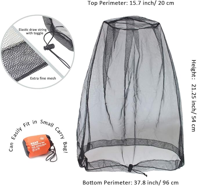 - Roomy Size- Updated bigger size with 21.25 inch/ 54 cm in height, bottom perimeter is 37.8 inch/ 96 cm; top perimeter is 15.7 inch/ 40 cm(approx.) Works over wide or narrow brimmed hats, caps, etc.Neck drawstring from the bottom of the head net mesh allows adjustment to really keep the little buggers out and comfortable wearing.