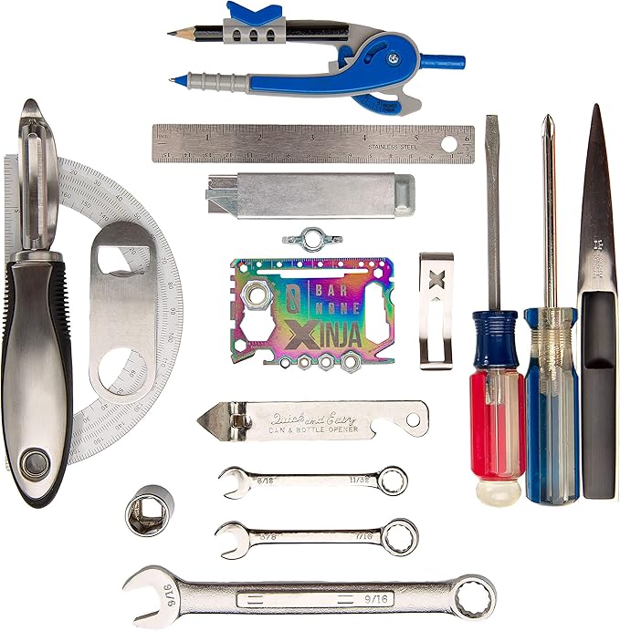 - 🔧 EXQUISITELY FUNCTIONAL ★ Packs 50 tools into a credit card sized multi-tool including screw drivers, rulers, dividers, hex bit driver, smartphone stand, wrenches, letter opener, nail puller, spoke keys, bottle opener, protractor, can opener, conversion charts, and more!