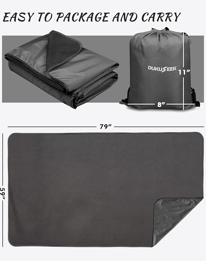 - ✅ 𝗘𝗫𝗧𝗥𝗔 𝗟𝗔𝗥𝗚𝗘& 𝗨𝗟𝗧𝗥𝗔-𝗟𝗜𝗚𝗛𝗧:This large outdoor camping blanket measures 79 x 59 inches (equivalent to a Queen Size Mattress) is large enough to wrap up to 2 adult. The large waterproof outdoor blanket is specially designed with a hook&loop fastener, so that you can wear it on your body to free your hands.