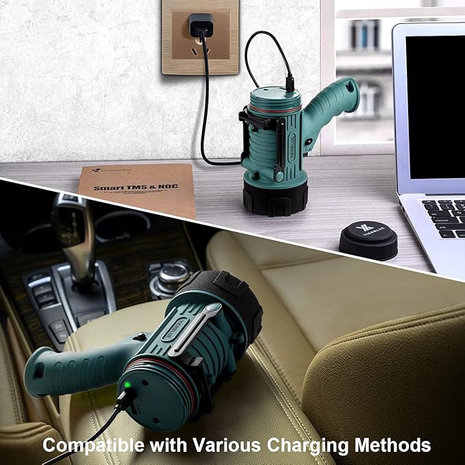- A revolution about charging: Our spotlight flashlightabandon the original charging mode, Using the latest generation of USB-C charging technology, the charging time is shortened from 10 hours to 4 hours. Compatible with various charging methods, you can charge this high power flashlights at home or in your car (charging adapter is not included).