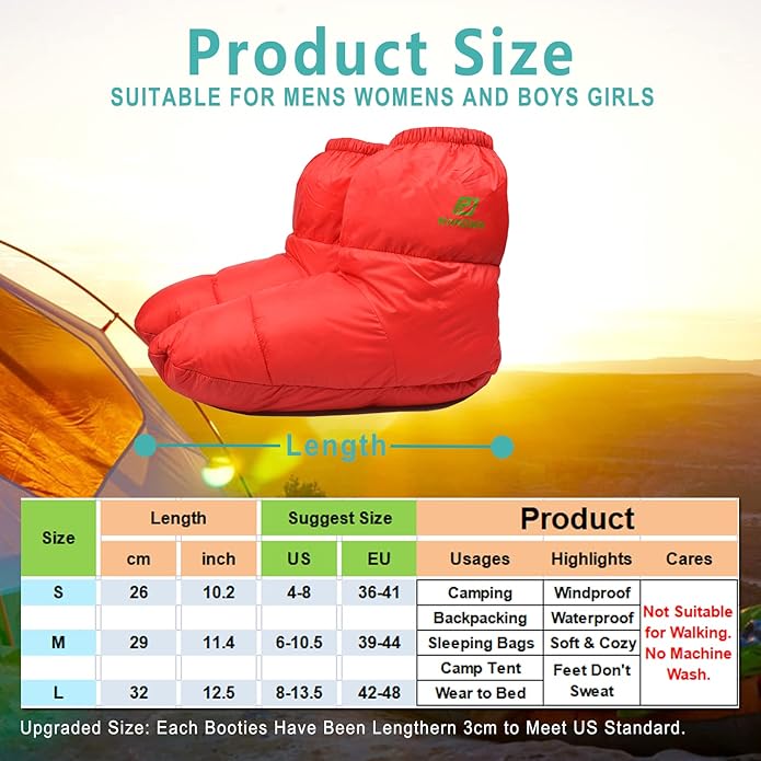 - HANDY FEATURES - Easily Put On and Take Off and Dependable. Upgraded Size: S-26cm/M-29cm/L-31cm. The Sleeping Booties Is Trusted By The Worlds Leading Campers. Great for Backpacking and Camping Trips