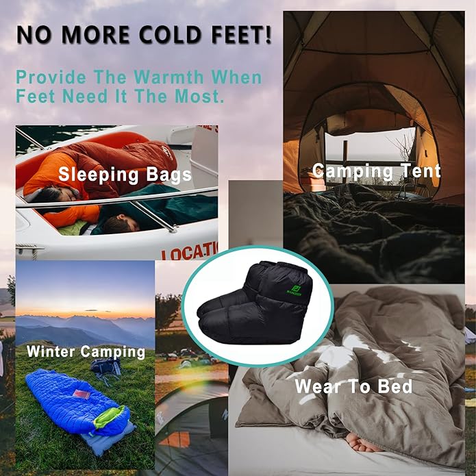 • DOWN BOOTIES FOR SLEEPING - No More Cold Feet! Warm Up Down Booties Keep Feet Toasty Warm While Sleeping In Camping Sleeping Bag, Camp Tent, RV or Around the House/Bed/Chair! Great for Sitting/Sleeping/Laying Down(Not For Walking)