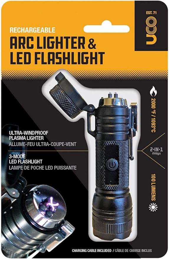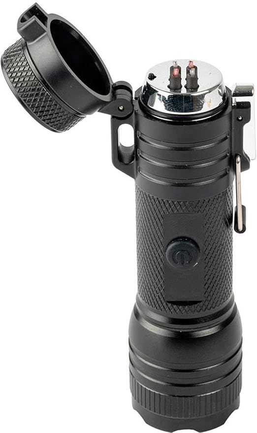 - Rechargeable Flashlight With Plasma Lighter: Flip open the locking, spring-loaded bezel to find the rechargeable lighter tucked inside this super bright flashlight