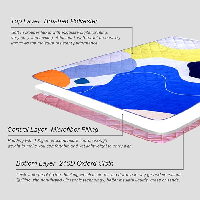 - THREE LAYERS: Made of multi-layers materials with ultra-sonic quilting technology. Soft brushed fabric on the top, padding with pressed microfibers, and sturdy 210D Oxford cloth as backing. Both the top and bottom are processed with waterproof finish,non-thread sewing further improves the moisture performance, and better insulates grass or sands. [Be Aware: No resistant to hot water!]