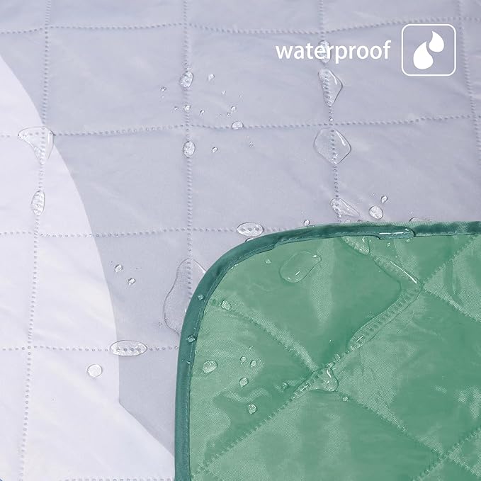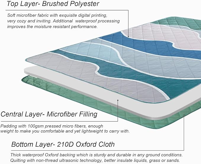 - Three Layers: Made of multi layers materials with ultra sonic quilting technology. Soft brushed fabric on the top, padding with pressed microfibers, and sturdy 210D oxford cloth as backing. Both the top and bottom are processed with waterproof finish,non thread sewing further improves the moisture performance, and better insulates grass or sands