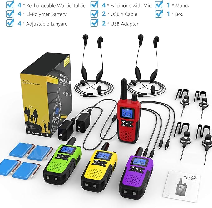- Included Components : Walkie Talkies for Adults Working, Kids Playing, High-Capacity Batteries for Extended Talk Time, USB Charger Y Cable for Fast Simultaneous Charging, Original Earpiece and Mic Sets for Private Chats, Belt Clips & Adjustable Lanyards for Ease of Carry Walkie Talkies for Adults Working, Kids Playing, High-Capacity Batteries for Extended Talk Time, USB Charger Y Cable for Fast Simultaneous Charging, Original Earpiece and Mic Sets for Private Chats, Belt Clips & Adjustable Lany… See more