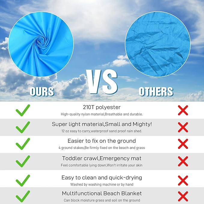 - 🏖️Beach Blanket Waterproof Sandproof:78''×81''size beach blanket,suit for 1-5 adults in total,odorless,made by parachute fabric.Rip-stop 210T polyester,light weight and small after folding.12 oz easy to carry,small and mighty!
