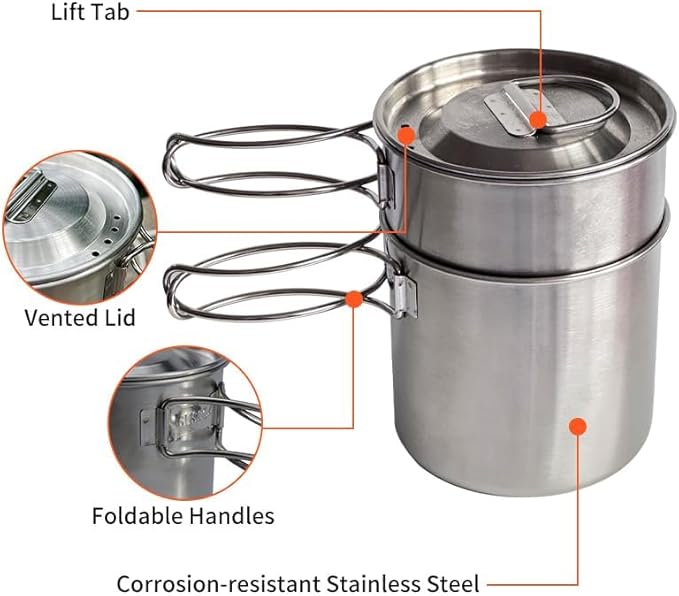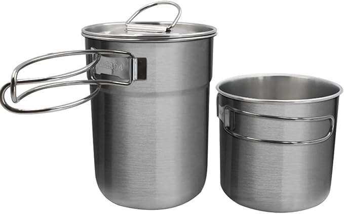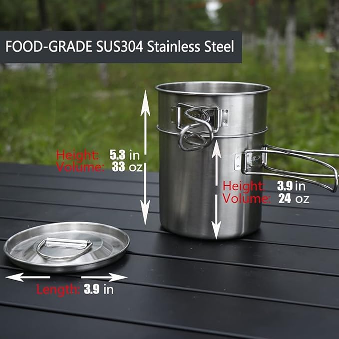 - 2-in-1 Cooking Cup Set:Adaptable as a cup or a pot, the Outdoors Stainless camping pot bottle is all in one! Including a 33oz big cup,24oz small cup,lid with 4-spiracle and a cloth bag,great for cooking food,tea or coffee,when camping, hiking, backpacking, outdoor adventure and survival.
