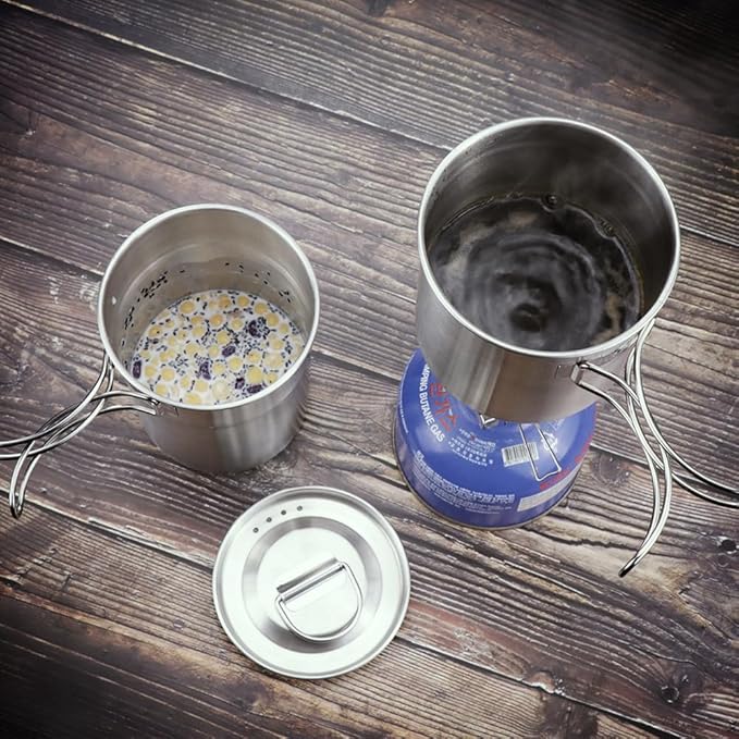 - Lightweight and Durable:Stainless steel camping cookware features 418g weight ,Compared with other materials such as aluminum and titanium, the stainless steel material makes the Camping Coffee Mug cups more durable rust resistant but lighter on your bag.