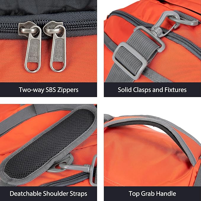 • Versatile Carrying Choices: Our travel duffel bag boasts detachable and adjustable straps, providing the option to wear it as a shoulder bag. Furthermore, two shoulder straps are cleverly concealed in the back zipper compartment, seamlessly transforming it into a backpacking backpack. The top handle allows effortless hand-carrying or convenient attachment to a suitcase. The side handles offer the flexibility to carry it alone or lift it jointly with a companion.