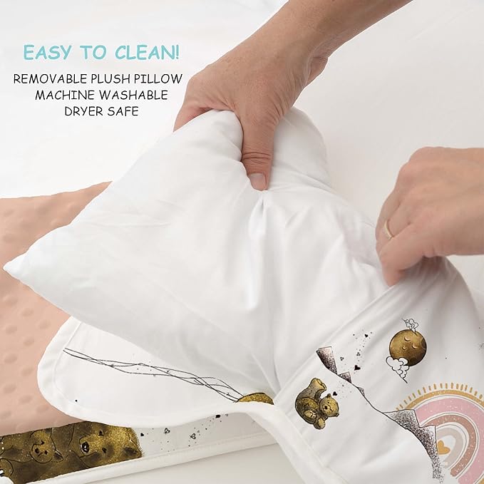 JumpOff Jo - Extra Long Toddler Nap Mat for Preschool, Daycare and Kindergarten - Sleeping Bag for Kids with Removable Pillow and Ultra Soft Blanket - Rainbow Bears