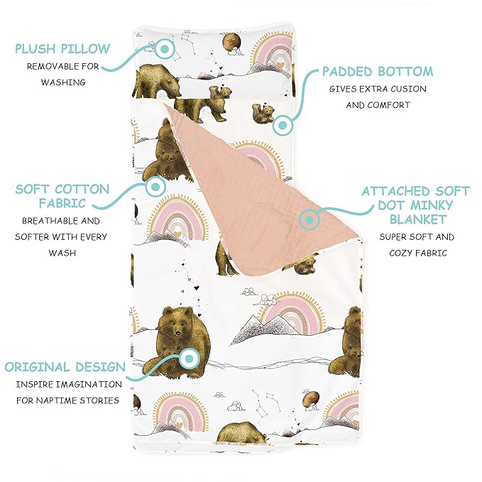 - Distinctive, Artistic Design: Snuggle up with Mama bear and her cub. This one-of-a-kind design ensures your child stands out. Our sleeping mats for kids ignite imagination and envy amongst friends.