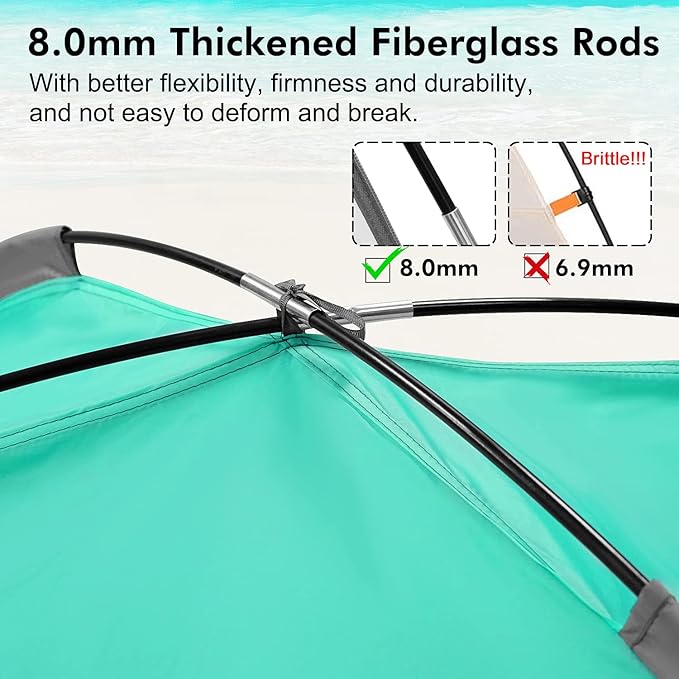 - 8.0mm Thickened Fiberglass Rods: We increased the thickness of the fiberglass rods to 8.0mm to make it more flexible, sturdy and durable. It can support the tent more stable and will keep shape even after long time use.