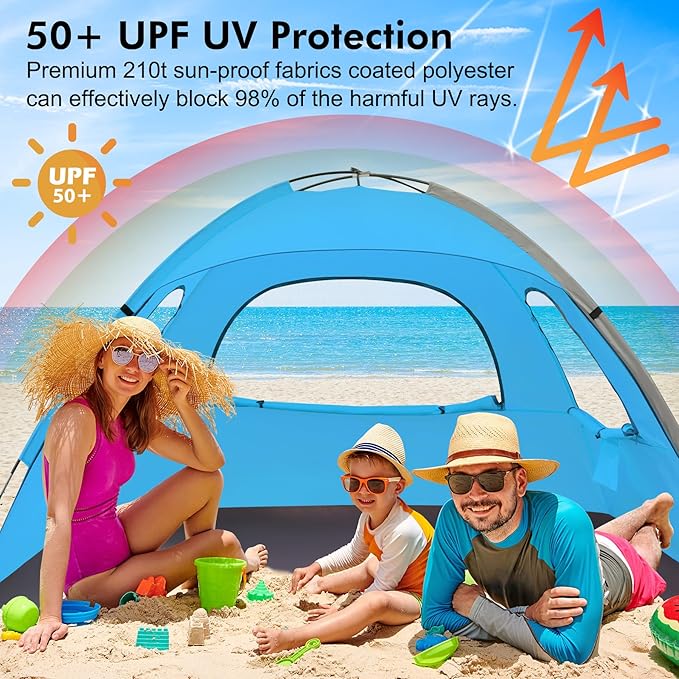 - UPF 50+ Protection & Excellent Ventilation: Our beach tent is made of premium 210t sun-proof material coated polyester, it can effectively block heat and 98% of the harmful UV rays. 3 super large roll up mesh windows increase airflow and reduce the temperature. It helps keep summer's scorching heat away from your family and allows you to enjoy the oceanic breeze with a comfortable space.